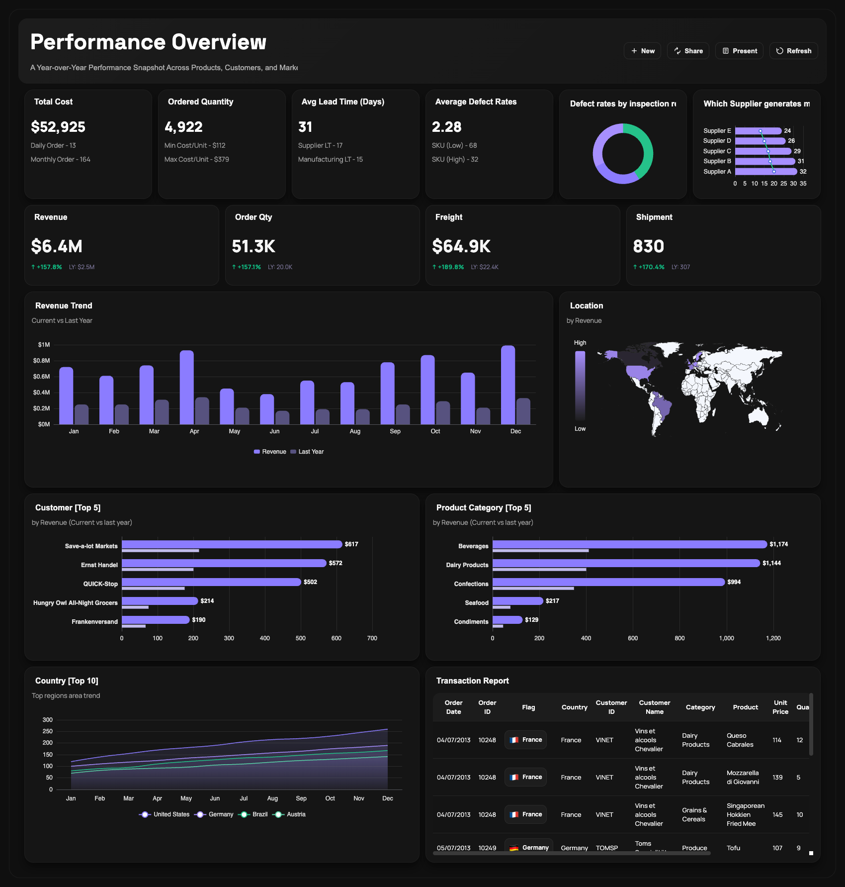 AI automatically selects the best charts, tables, and KPIs for every query — optimized for clarity and insight.